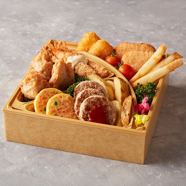 鶏唐揚げ、エビフライ、チーズスティック、ハンバーグなどボリュームたっぷりの満足BOX ※ハンバーグのケチャップはつきません