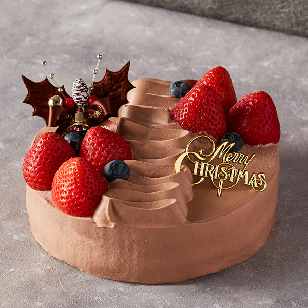 チョコレート香るなめらかケーキ。飾りいちごとたまごは海老名産を使用