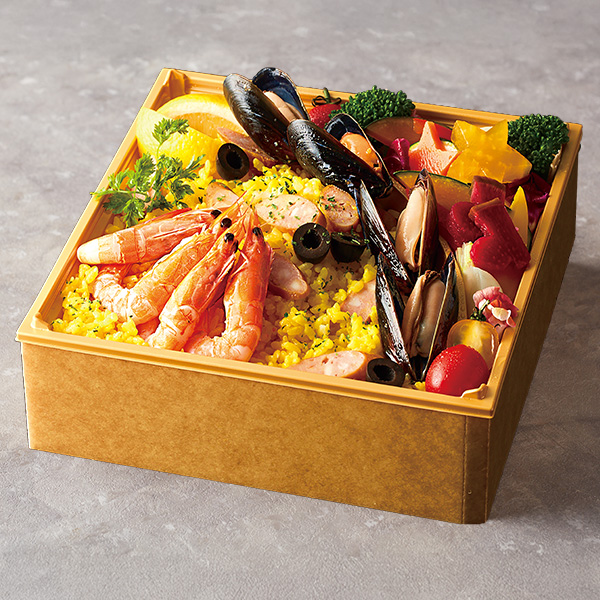 海老やムール貝などの魚介をパエリア風に。付け合わせの野菜は数種類そろえ、バーニャカウダ風ソースでマリネしました。