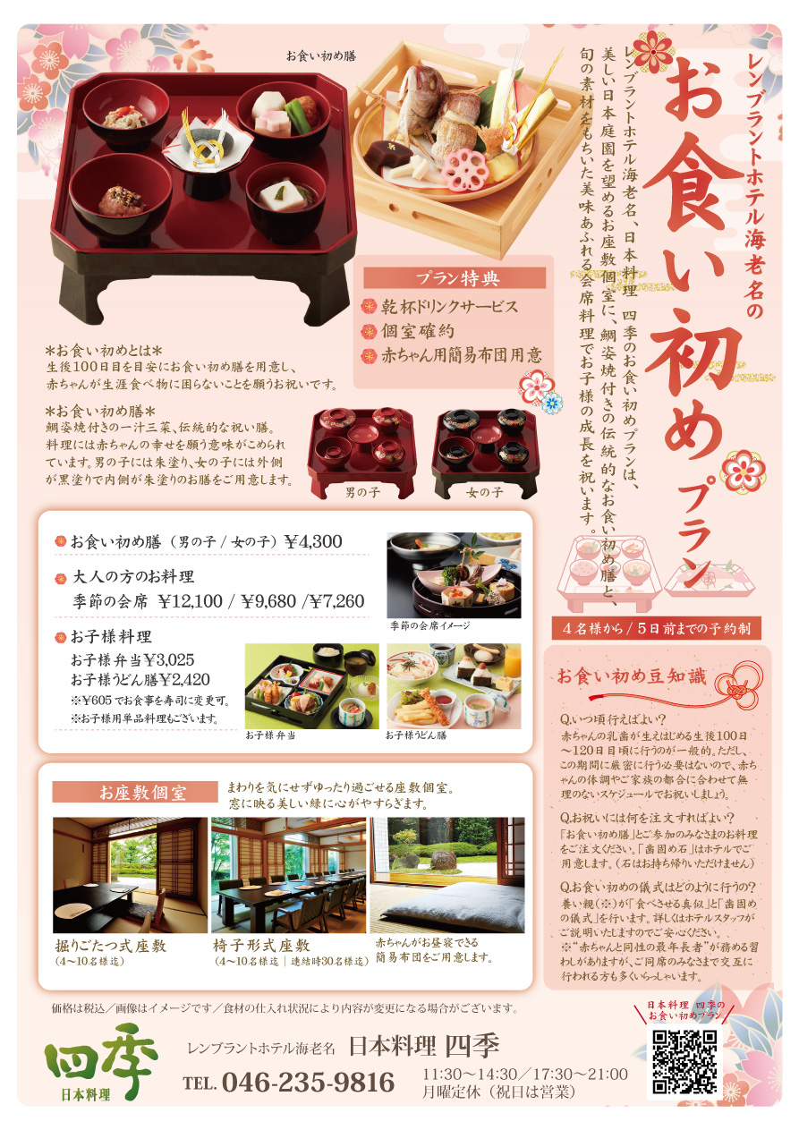 レンブラントホテル海老名、日本料理 四季のお食い初めプランでは、美しい日本庭園を望めるお座敷個室に、鯛姿焼付きの伝統的なお食い初め膳と、旬の素材をもちいた美味あふれる会席料理をご用意いたします。
