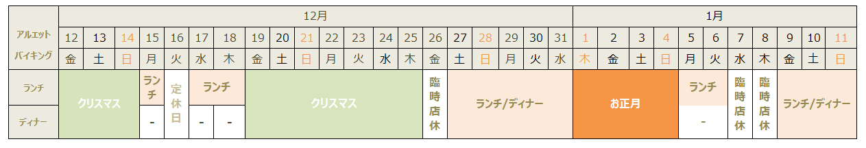 年末年始の営業スケジュール|バイキング