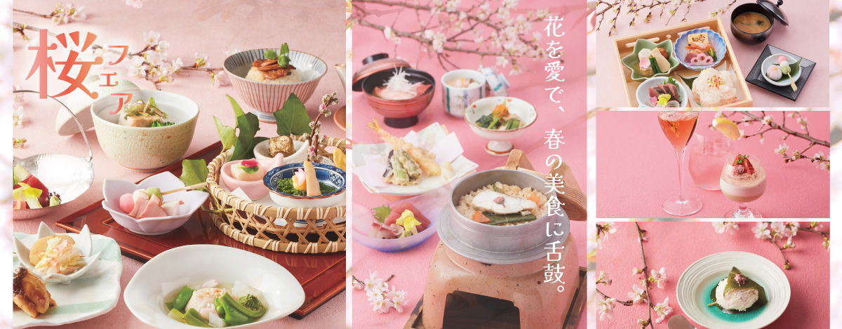 日本料理「四季」では、桜が花咲く空間で美食を楽しむ「桜フェア」を開催中です。庭園から望める山桜やソメイヨシノのほか、店内にも桜の生花を飾り、開花時期以外にも可憐な花を愛でながらご会食いただけます。