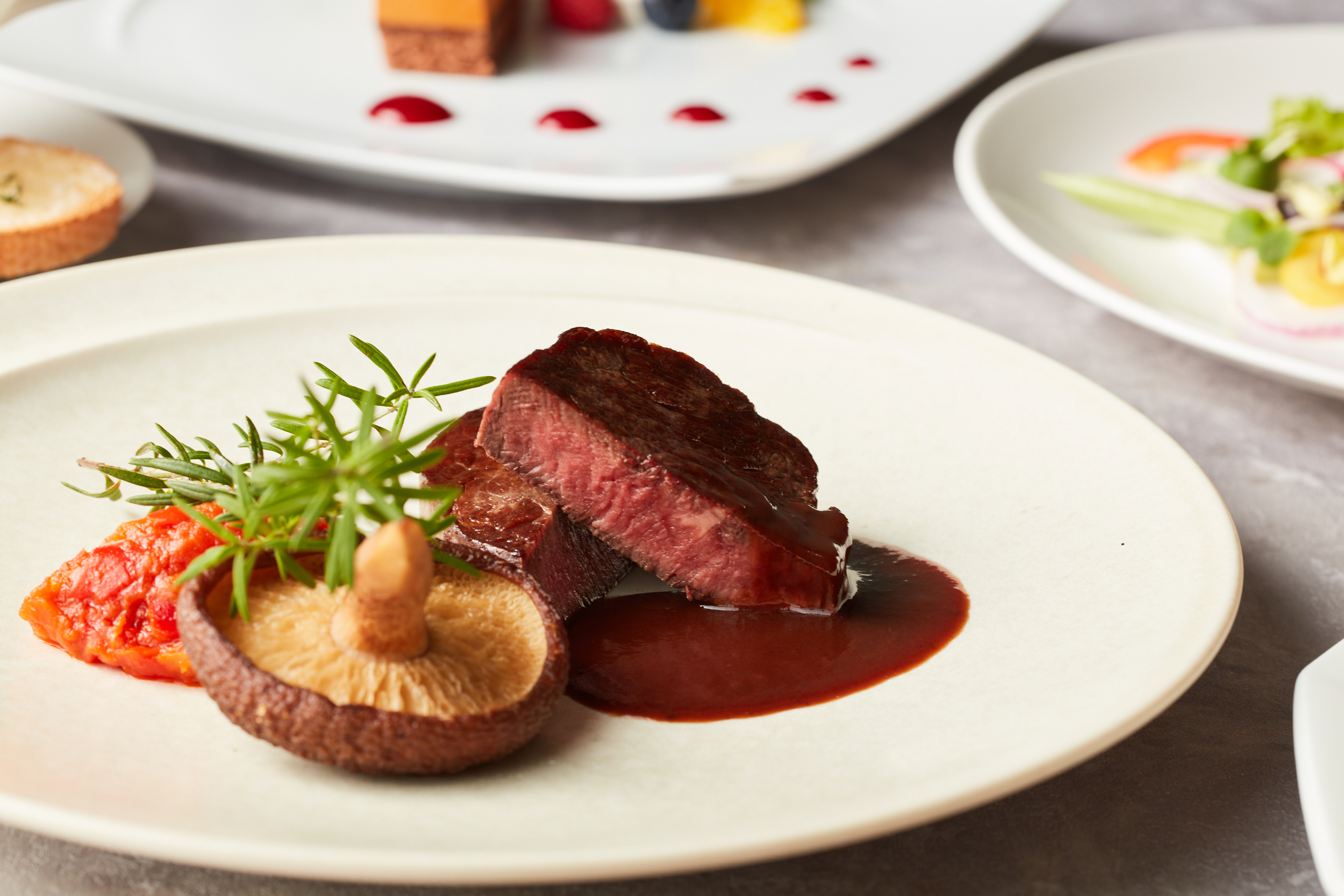 和牛フィレ肉のグリル トリュフソース または 仔羊の低温ロースト ペルシアード風