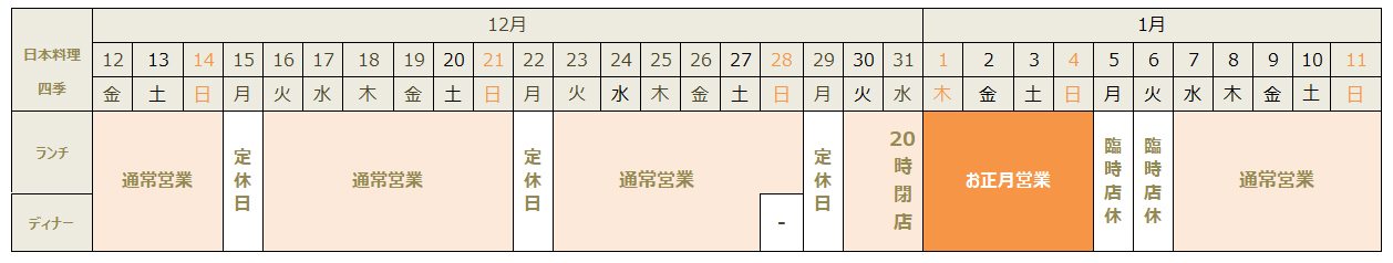 【年末の営業】12/31は19:00ラストオーダー、20:00閉店。お料理は¥3,630(税サ込)より承ります。
