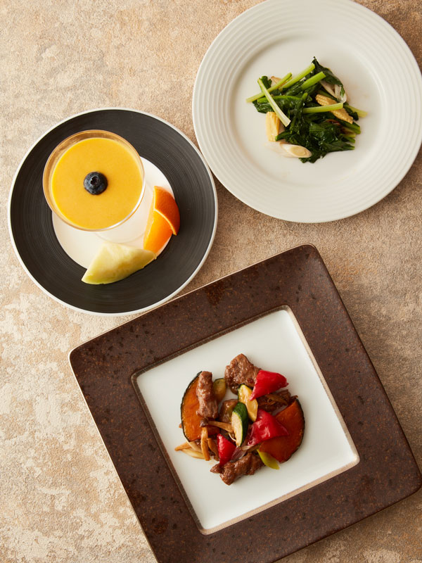 ~美味しく健康に美しく~。前菜・スープから各食材のメイン料理まで750kcalほどで構成したヘルシーなコースです。