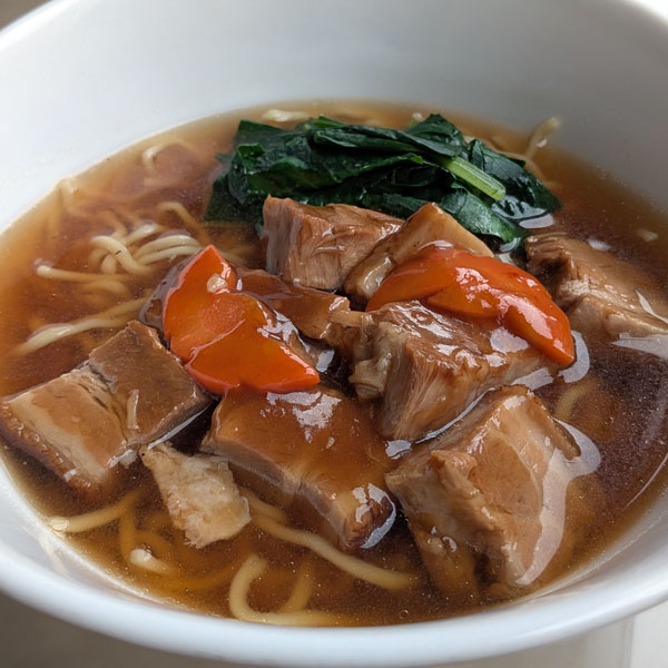 じっくりと煮込まれており、トロトロの食感が楽しめます。つゆそばは、豚角煮の旨味がしっかりと染み込んだスープで、温かくて心地よい一杯です。特に寒い季節には、体を温めるのに最適な料理です。豚肉のコクとそばの相性が抜群で、満足感のある一品です。