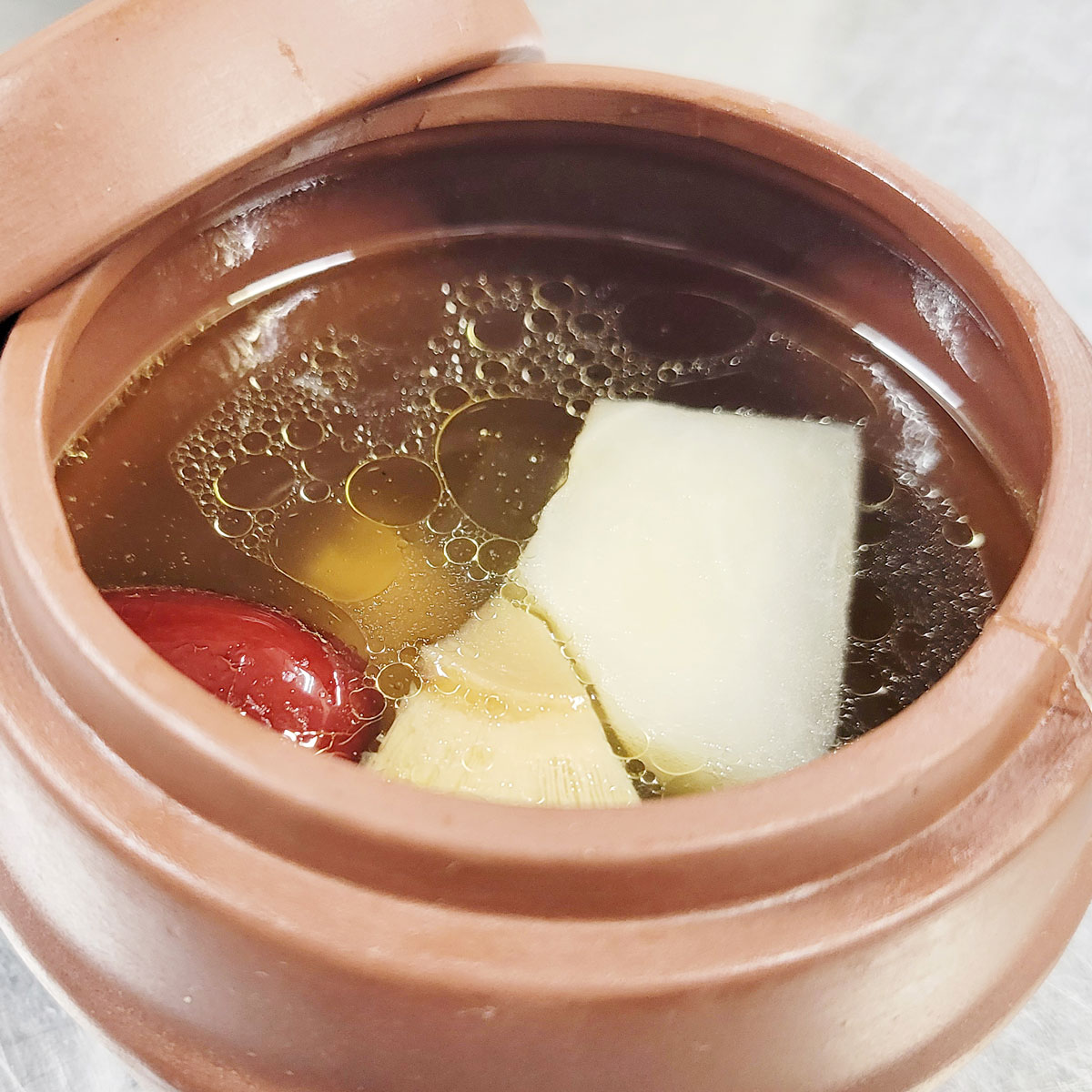 蕪と椎茸の旨味が凝縮された優しい味わいが特徴です。蒸すことで素材の栄養素が逃げず、蕪の甘みと椎茸の風味がしっかりと引き出されています。軽やかなスープは、健康志向の方にもおすすめです。