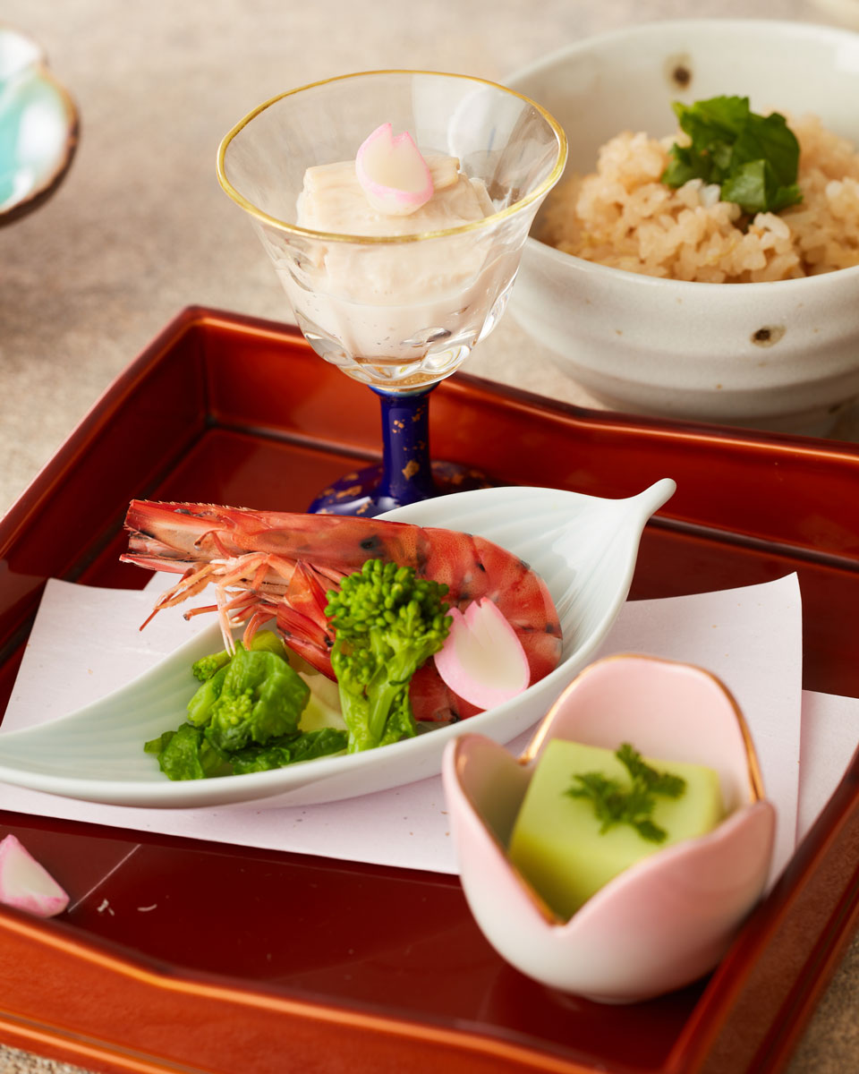 胡麻豆腐 菜花浸し 海老旨煮 生湯葉 桜鯛手毬寿司 花びら百合根